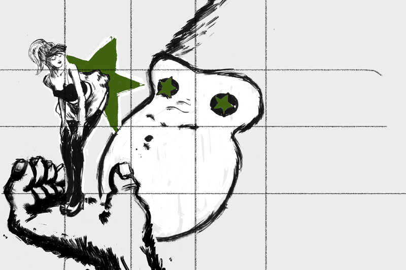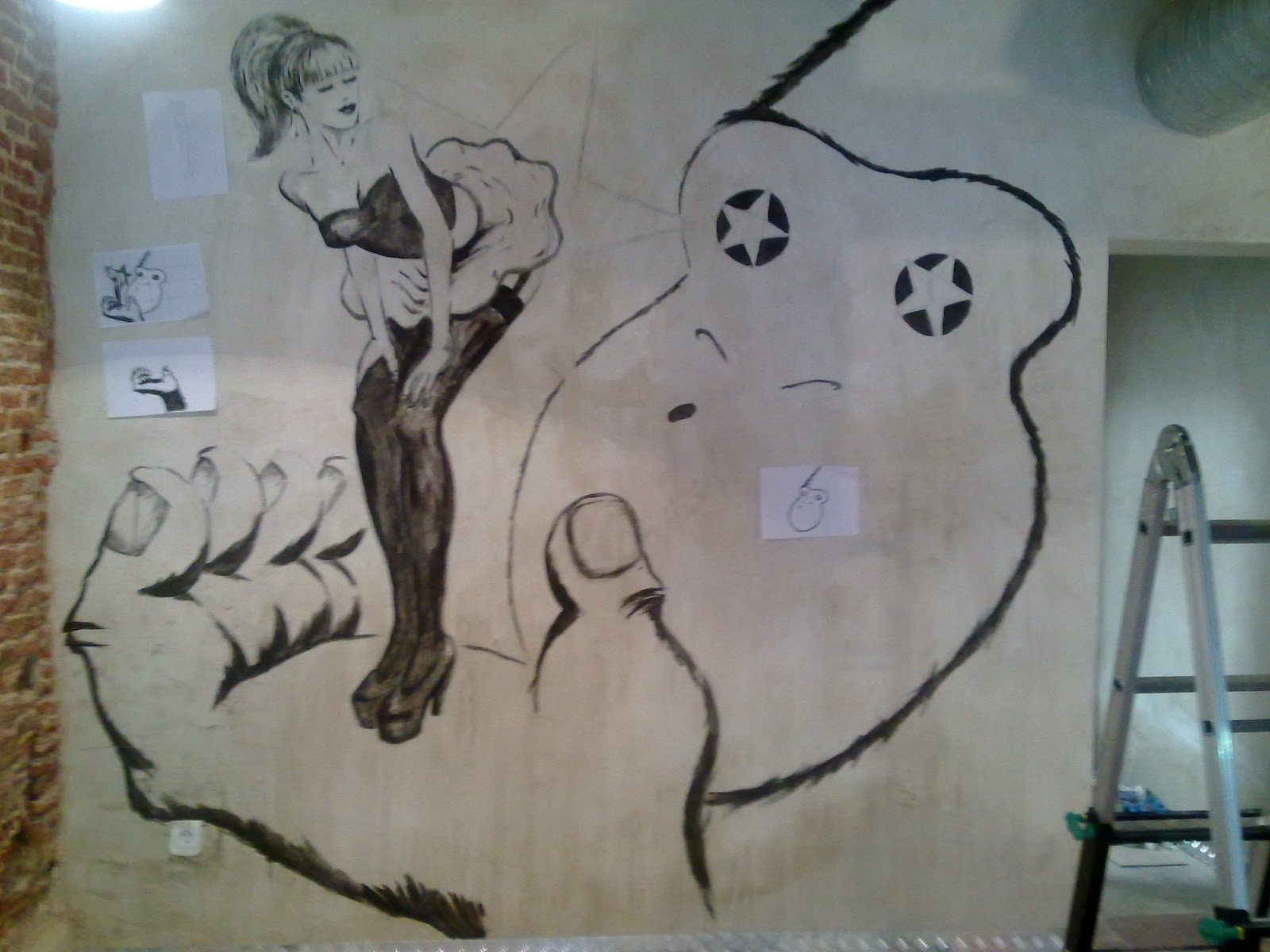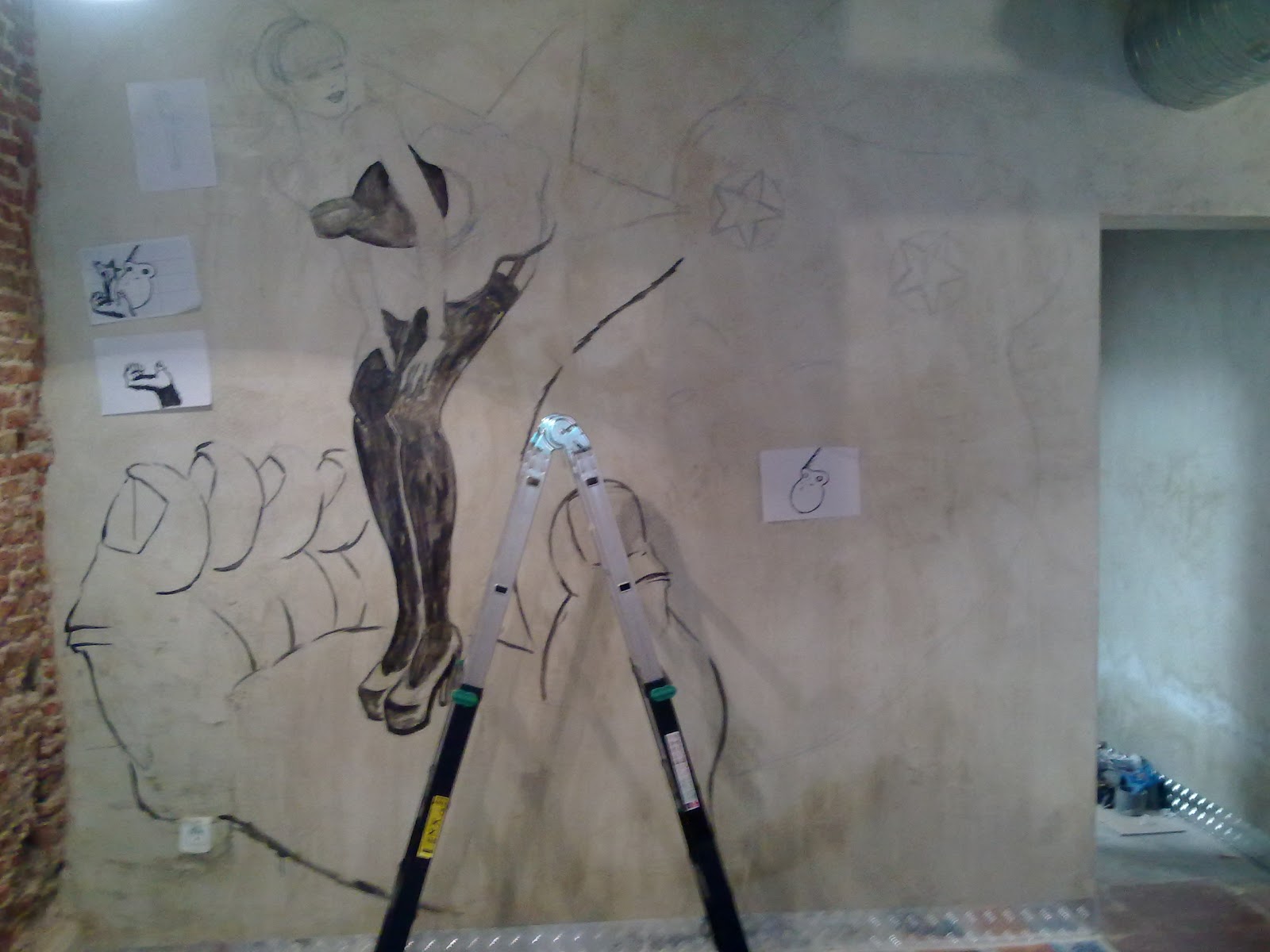 Sólo faltaba rematarla en la pared. Con el planteamiento final, en el que los cuerpos no tienen base de color y van las líneas sueltas encima de la pared a «cara vista»(creo que este es el término), había una dificultad que me daba bastante miedo. No tendría margen de corrección. No podría usar el color del fondo para tapar errores, gotas o imprevistos que pudieran salir. Así que tocaba ir con la lección muy aprendida. Hice muchos bocetos de los elementos por separado y generé una imagen que resultaría definitiva.